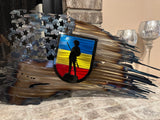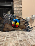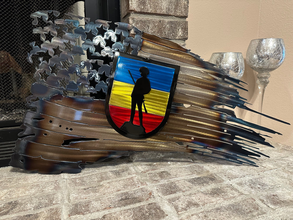 This beautiful handmade Tattered American Flag representing the Great United States Army was created using a skilled technique called heating. During this process, the metal will go through many stages and it's the detailed eye of the artist to be sure the desired colors are maintained without applying too much heat. The piece is perfect for any home decor setting.