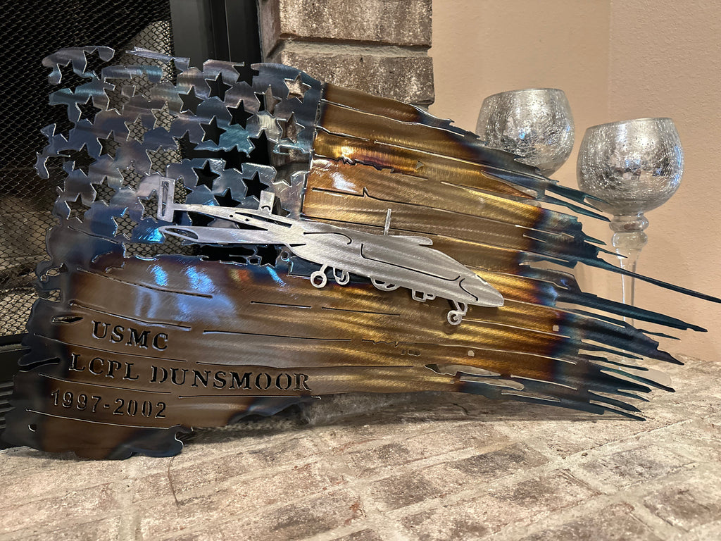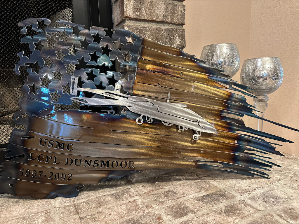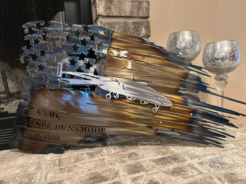 This beautiful handmade Tattered American Flag representing our Great United States military was created using a skilled technique called heating. During this process, the metal will go through many stages and it's the detailed eye of the artist to be sure the desired colors are maintained without applying too much heat. The piece is perfect for any home decor setting.